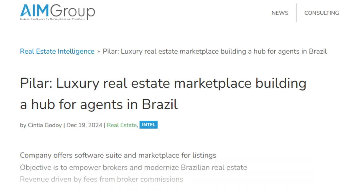"Pilar: o marketplace do mercado imobiliário de luxo que está criando um hub para corretores no Brasil."O AIM Group (Business Intelligence for Marketplaces and Classifieds) escreveu sobre a Pilar como uma iniciativa inovadora no mercado imobiliário, destacando nossa contribuição para tornar o setor mais eficiente.Como afirmou nosso CEO, Felipe Abramovay: "Nós queremos que o corretor seja o centro da experiência imobiliária."